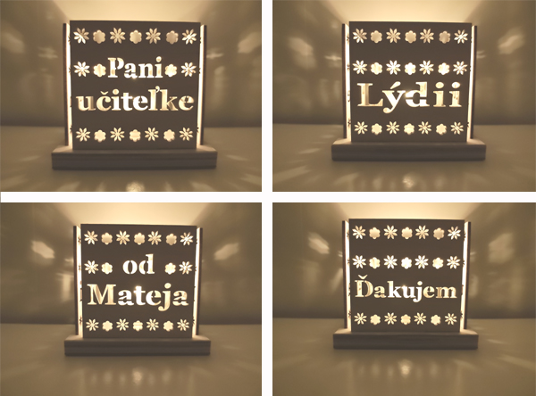 Chcete, aby bol váš svietnik ešte špeciálnejší? Umožňujeme jej personalizáciu! Pri objednávke nás informujte o mene p. učiteľky a meno dieťaťa, a my ich s láskou zakomponujeme do návrhu. Pre poskytnutie individuálneho grafického návrhu nás prosím kontaktujte do 24 hodín od zrealizovania objednávky. Po vašom schválení začneme s výrobou a zaslaním do 2 pracovných dní.