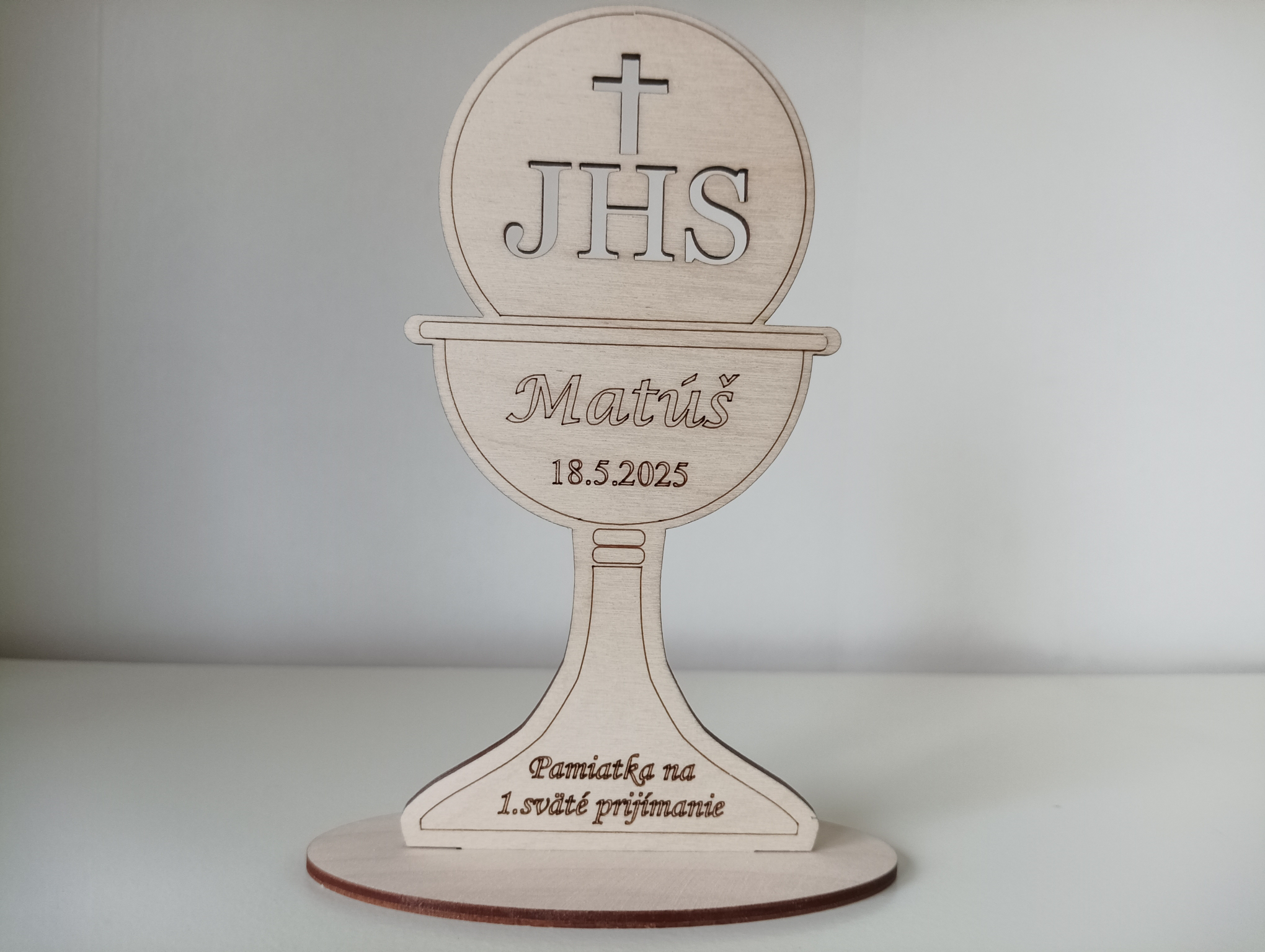 Kalich vyrobený z brezovej preglejky slúži ako milá pripomienka prijatia tejto sviatosti.