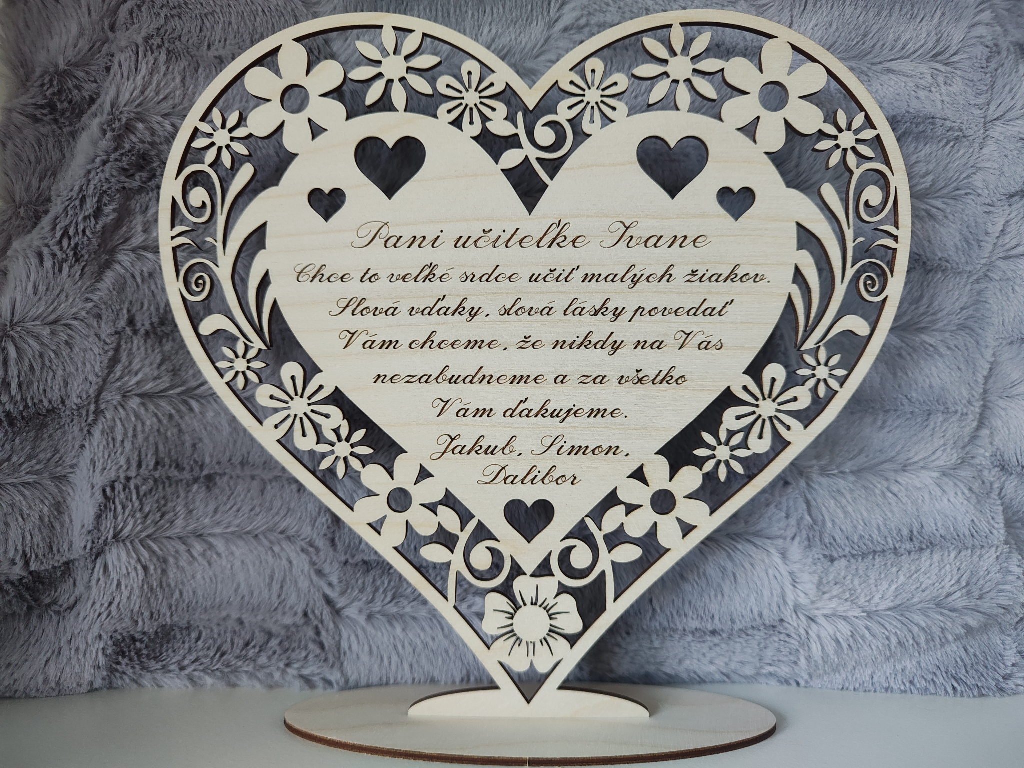 Drevené srdiečko na podstave pre pani učiteľku, vyrobené z brezovej preglejky s hrúbkou 3 mm.